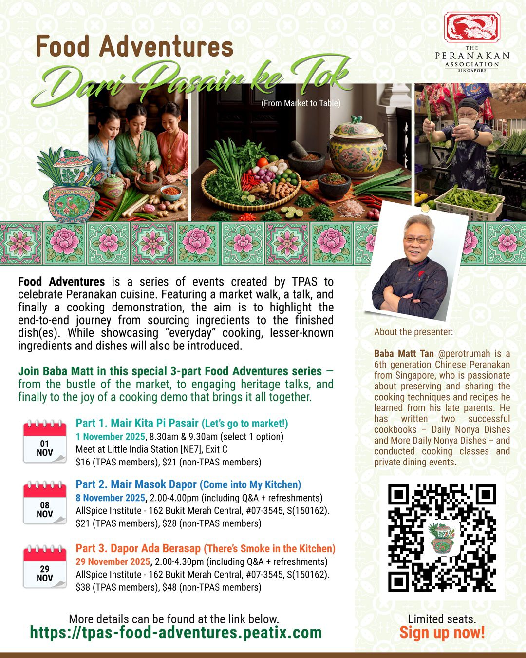 Join Baba Matt Tan on a trip around Tekka Market, as he points out common and not so common ingredients used in Peranakan cooking.Date & Time: 1 November 2025, 8.30am and 9.30am (Please choose 1 timing)