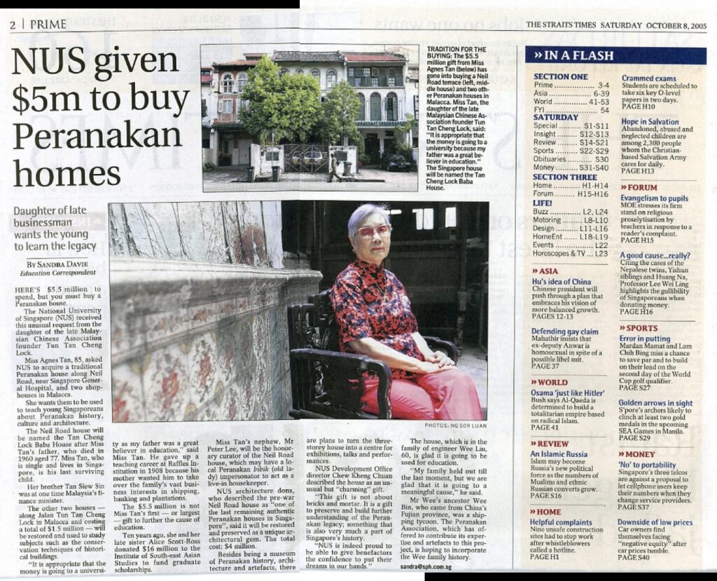 His legacy continues with the philanthropy of Alice, Nellie and Agnes, bestowed in his memory. In 2004 Agnes gave NUS $1.5 million for the Tun Tan Cheng Lock Centre for Asian Urban and Architectural Heritage in Malacca, and a further $6 million two years later for the establishment of NUS Baba House. In 2016 she also funded the Tun Tan Cheng Lock Bursary and Merit Award in Malay studies with the Singapore University of Social Sciences.