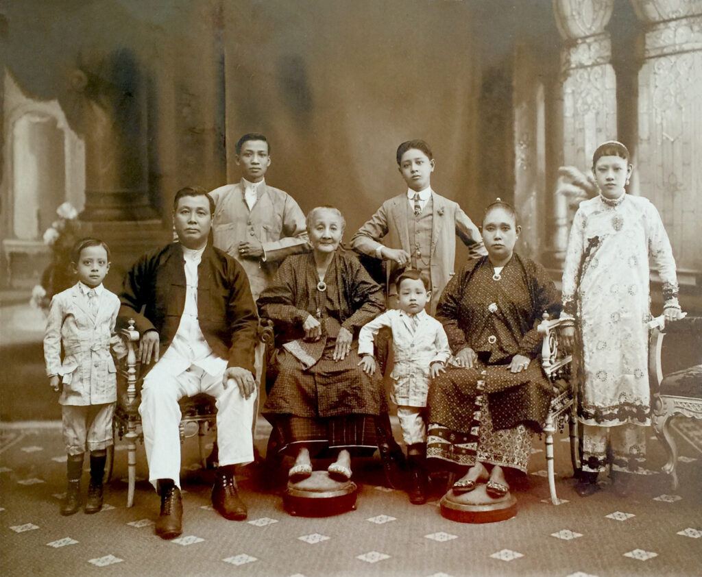 Lim Eng Neo with one of her sons, the prosperous rubber trader Chua Lip Sian and his family in high sartorial fashion. His wife, seated at right, was Tan Teck Hoon Neo, a cousin of Tan Jiak Kim, the founding president of the Straits Chinese British Association (now The Peranakan Association Singapore). Lip Sian’s daughter, Margaret Chua Swee Him, standing at extreme right, is in a stylised outfit combining Chinese and Western elements. Standing from left is Lip Sian’s younger brother, Lip How, and his eldest son, Poh Boon. His younger sons in jackets and boots are Poh Boo (extreme left) and Poh Chuan (middle). Circa 1913. Photograph taken at the Lee Brothers studio at Hill Street, Singapore. Courtesy of Charles Seet.