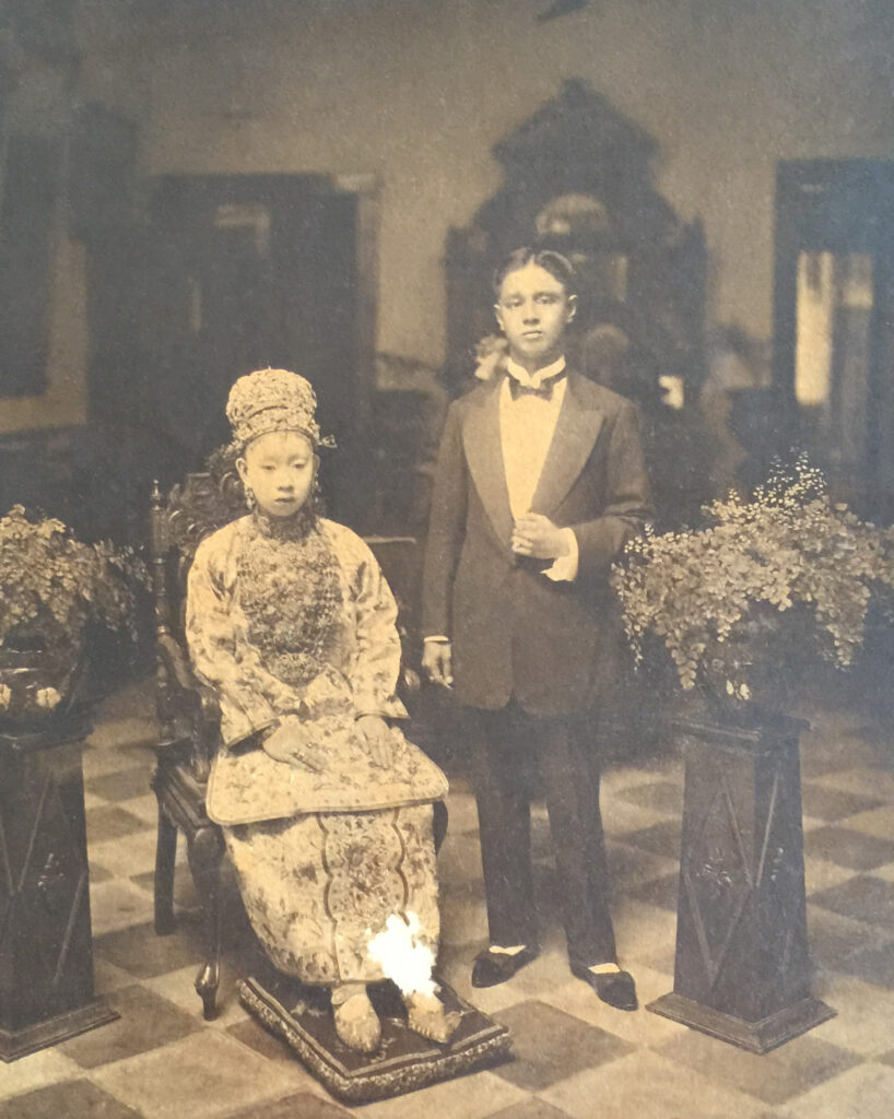 The boy’s fedora hat indicated the Babas’ Anglophile lifestyle at the turn of the 20th century. The clock confirms the evolution of a “look to the West” trend that was starting to take hold as more babas starting going to learn English at schools like Raffles Institution, St Joseph’s Institution and Anglo-Chinese School (ACS). The trend accelerated in the 1860s.
