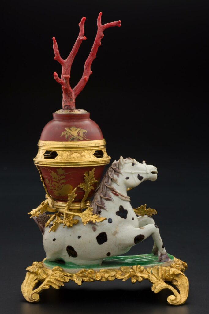 This incense burner was assembled in Europe during the eighteenth century from several components. The Chinese porcelain horse, made in the Kangxi reign (1662–1722), is realistically modelled on a green-glazed base that imitates grass. Above it are two Japanese lacquer bowls set rim to rim; inside them is a metal tray to hold burning incense that would escape through openings in the gilded ring connecting the bowls. Crowning the object is a piece of red coral. The pieces are held together by gilded bronze fittings made in Europe. Imaginative creations like this, which blend objects from different cultures and mix the natural with the man-made, were favoured in Europe in the Baroque and Rococo periods (17th and 18th centuries).