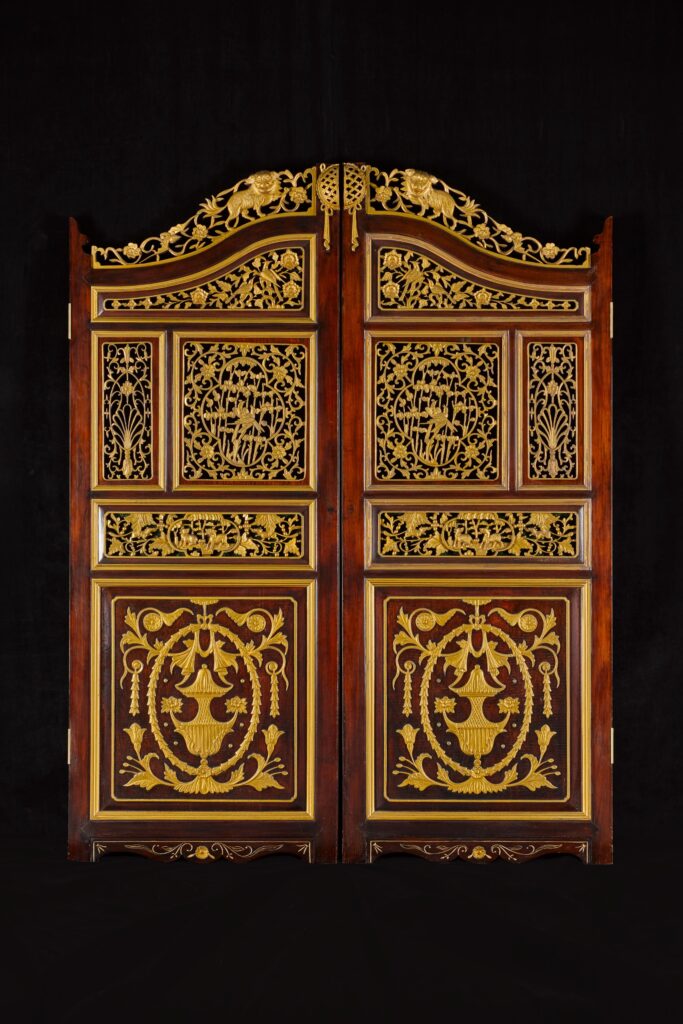This unusual pintu pagar is carved and gilded on both sides with an eclectic mix of Chinese and European motifs consisting of lions, flowers, squirrels, and vases. Most pintu pagar are carved on only one side. The curved top was a popular feature in Singapore. Finely carved pintu pagar served as symbols of wealth for Peranakan families, visible to all visitors.