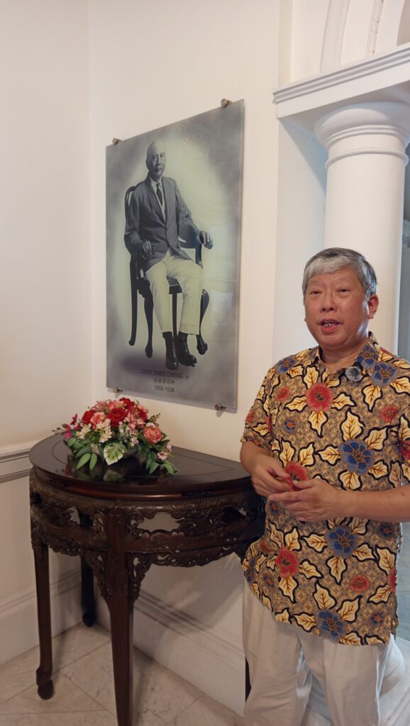 The house tour was conducted by Baba Ronney Tan, who shared fascinating narratives about the family’s origins, the first Chee progenitor having arrived in Melaka from China around 1727, and then set up multiple business ventures including property development, money lending, and rubber. He guided us through the mansion’s ornate interiors and pointed out the numerous portraits of various family members that hang on its walls. The mansion’s eclectic architectural style, attributed to Dutch architect James Westerhouse, blends Dutch, Portuguese, British and Chinese influences, reflecting Melaka’s multicultural past and the Chee family’s place within it. Understandably a focal point of ancestral remembrance, the estate retains its spiritual importance as an active family shrine under the custodial care of Chee descendants.