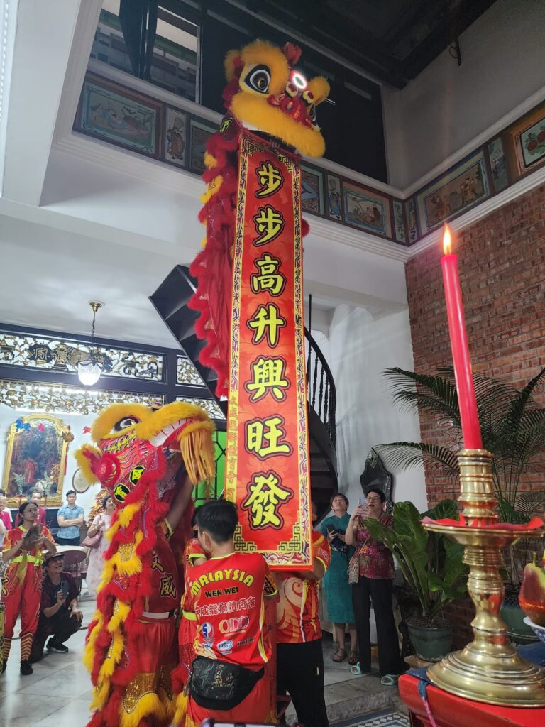 As darkness fell and the Semayang Tikong rites commenced, our group visited the Chee family home located next to the Ancestral House. The night came alive with an energetic Lion Dance performance, symbolising auspicious blessings and spirited protection. Elaborate altar displays rich with offerings — fruits, cakes, meats, incense and joss paper structures — honoured the Jade Emperor. These offerings represent gratitude, reverence, and prayers for prosperity and well-being. The ritual of paying homage on this night is deeply rooted in the narrative of ancestral survival and thanksgiving that resonates widely among Hokkien-Peranakan communities.