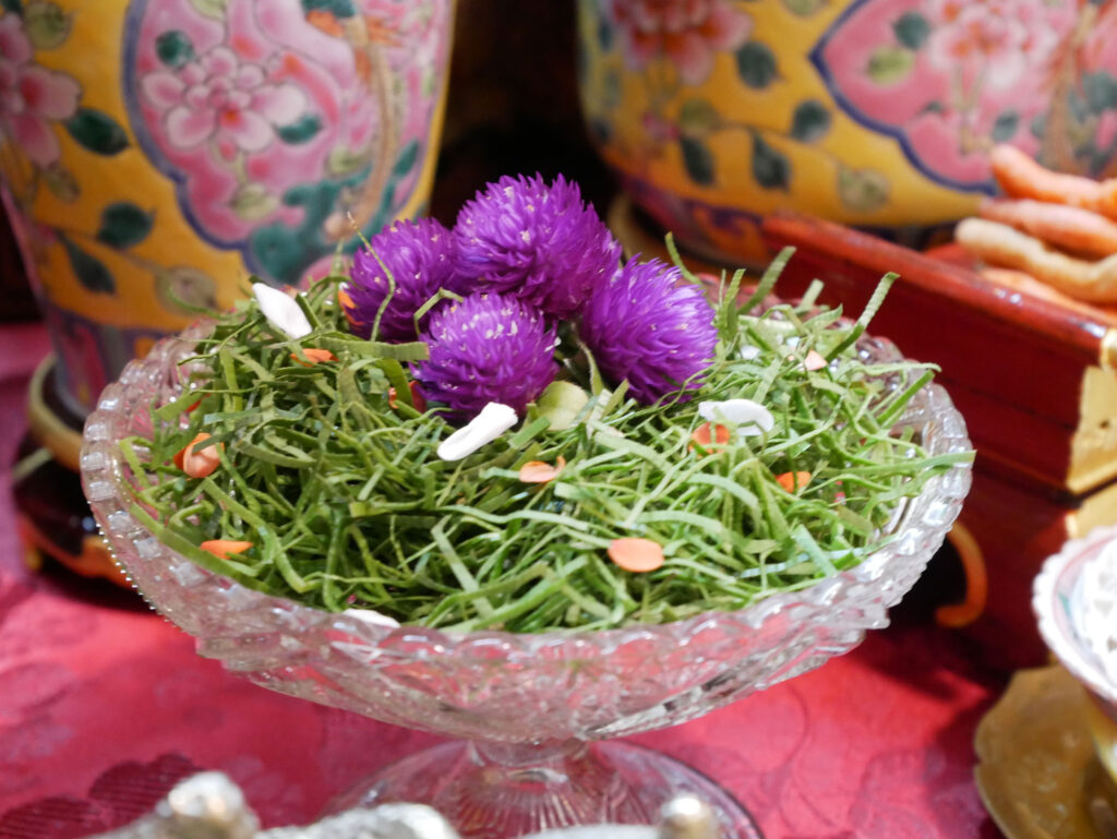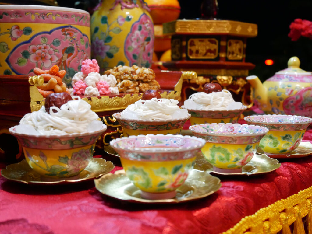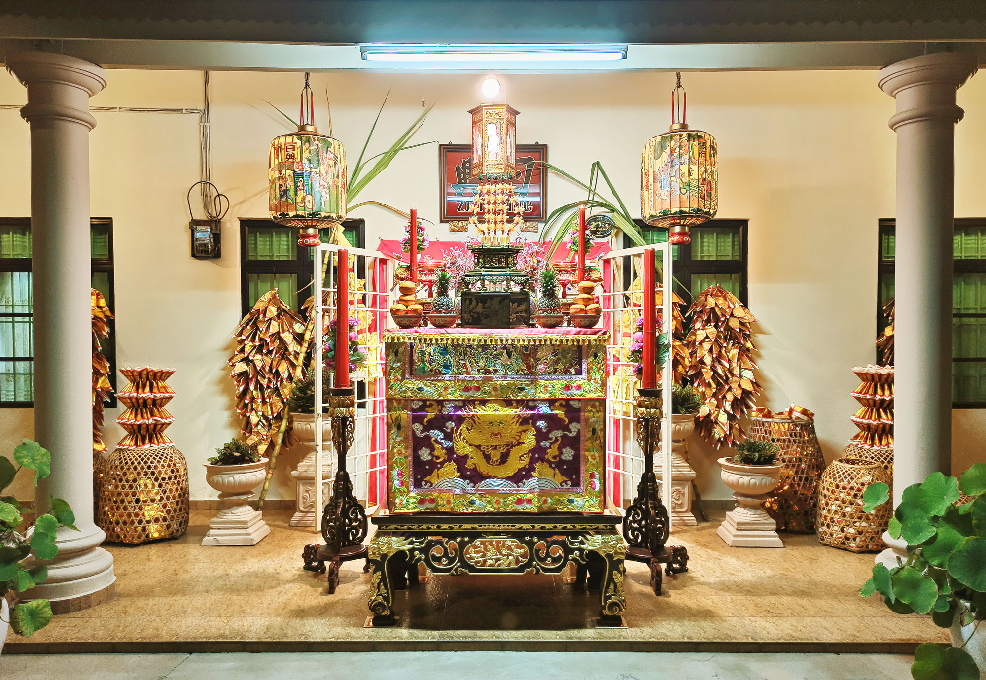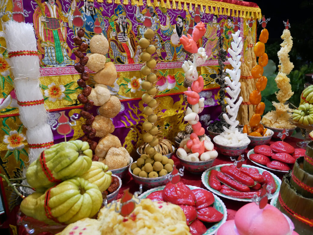 The main offering is known as the chanap, candied papaya that is hand-carved and skewered, to be placed atop the black lacquered chanap container which takes prime position on the elevated tok samkai altar – considered the grandest and most sacred altar dedicated to Tikong, the supreme Taoist deity. Bouquets of fresh flowers, pairs of red candles lit throughout and fragrant sandalwood joss sticks are placed alongside rows of carefully arranged fruit and cake offerings.
