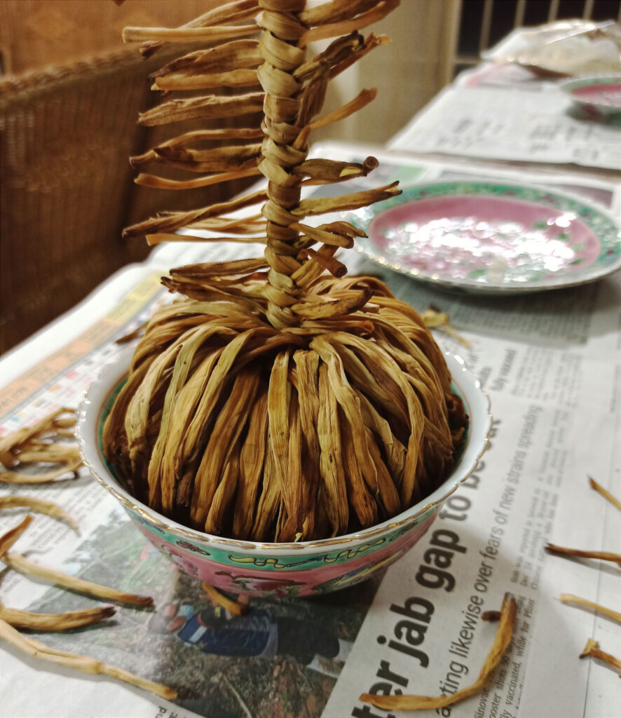 I began to develop an interest in the chanap. Eventually, I learned the skill from my Chimpohor (grandaunt) who is one of the very few in Melaka skilled in the art. Chimpoh had not done it for so many years. Thankfully, she remembered after some months and taught me all. Since then, our family has put up the tok samkai again every year.