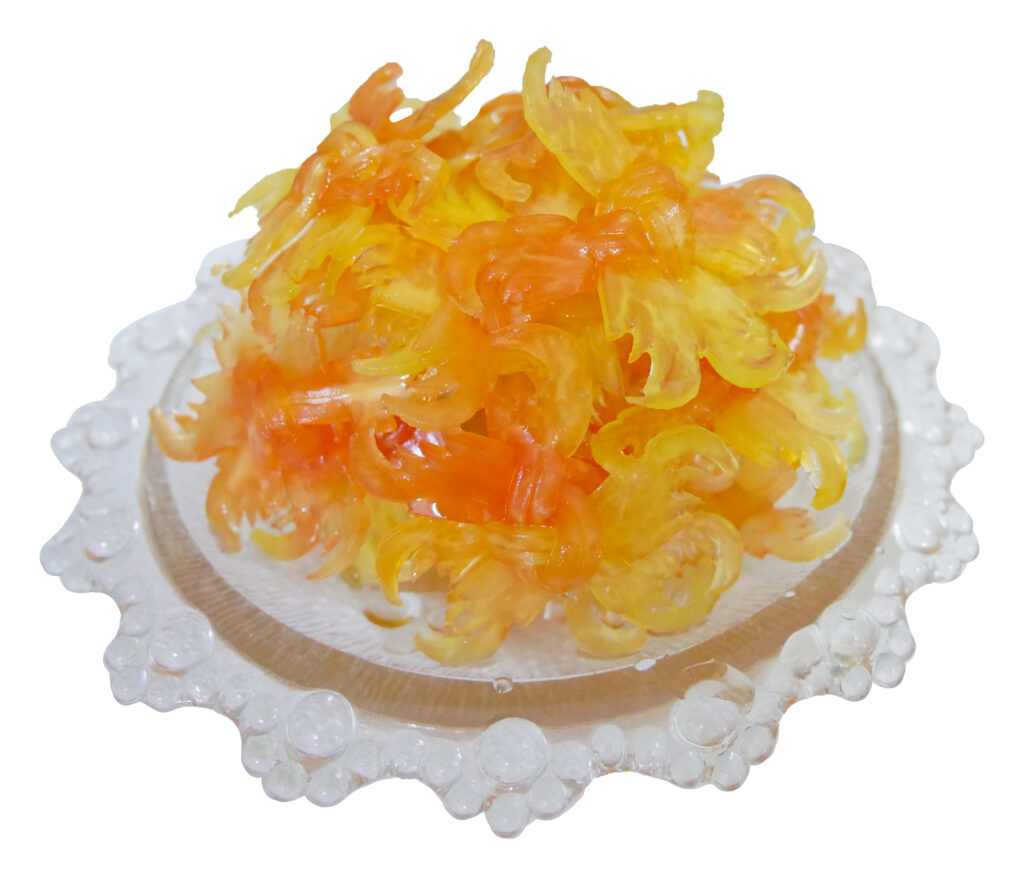 To make the chanap, half-ripe papaya is thinly sliced and soaked in salt water to dehydrate it, then woven and carved into crab shapes. The papaya is then soaked in kapor or lime water to harden the carvings before soaking it again in syrup for preservation.