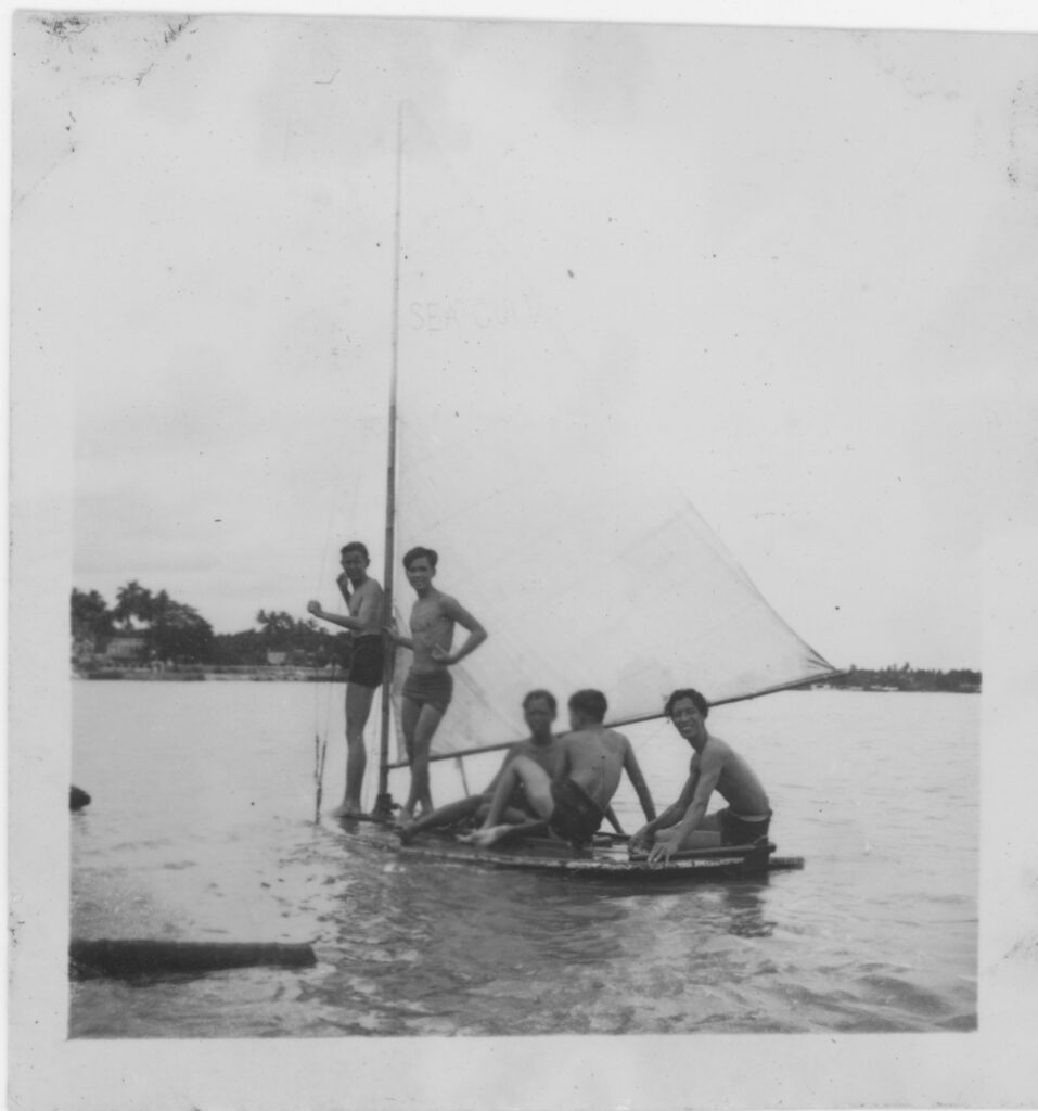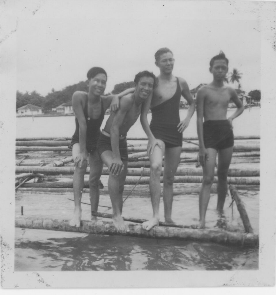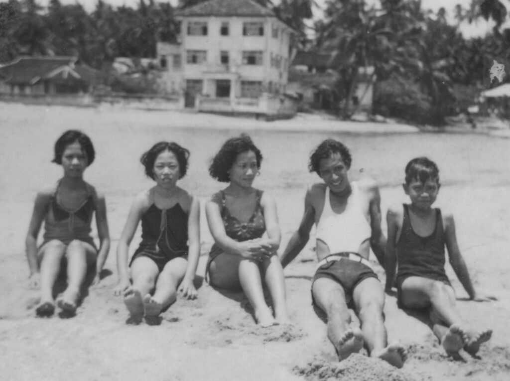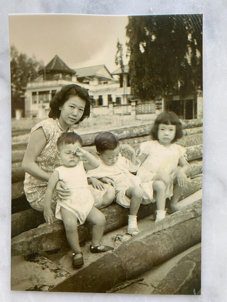 Maureen’s third aunt at the beach in front of 157/159 Marine Parade with her children. Local fishermen used to beach their sampans or boats overnight. They are sitting on nibong poles, which were used as kelong stakes. The house behind, at top left, is where the then-Tung Ling English School used to be, now the Church of Singapore. During the Occupation it was used as the Japanese Officers Club. Today, Parkway Parade would be opposite, on reclaimed land where the beach used to be.