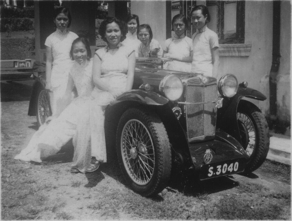 Nyonya Cheong Keong Tuan is seen sitting in front, on Kong Hai’s red MG sports convertible.