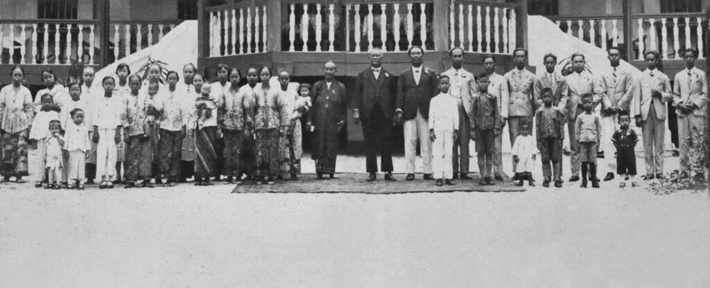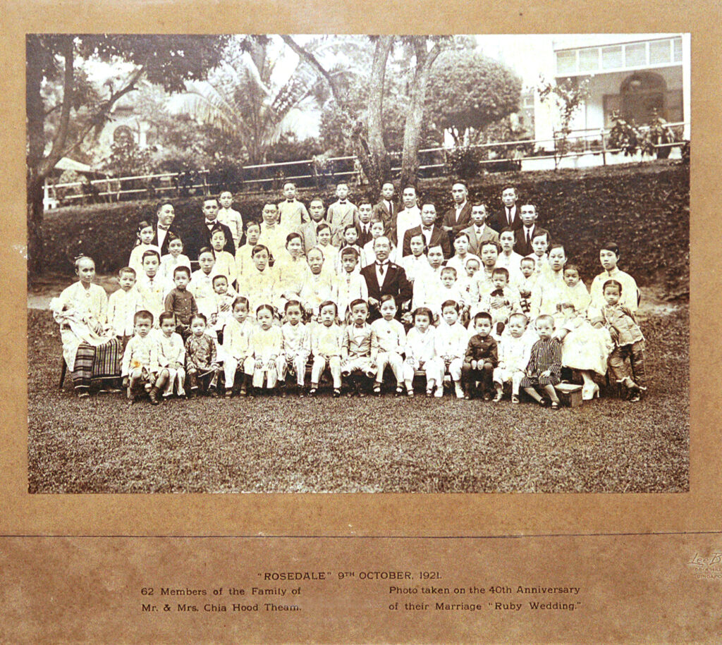 1921: Chia Siew Tin came from another well-connected family in Singapore. She was the daughter of Chia Hood Theam (middle, in dark suit with cravat) who had 11 children and numerous grandchildren. She is standing behind her father’s left shoulder. Cheong Koon Seng is behind her. Baba Hood Theam was Comprador of the Mercantile Bank, a position he passed to sons Keng Tye and Keng Chin. Photograph courtesy of Dr Noreen Chan, the great great grand-daughter of Baba Hood Theam.