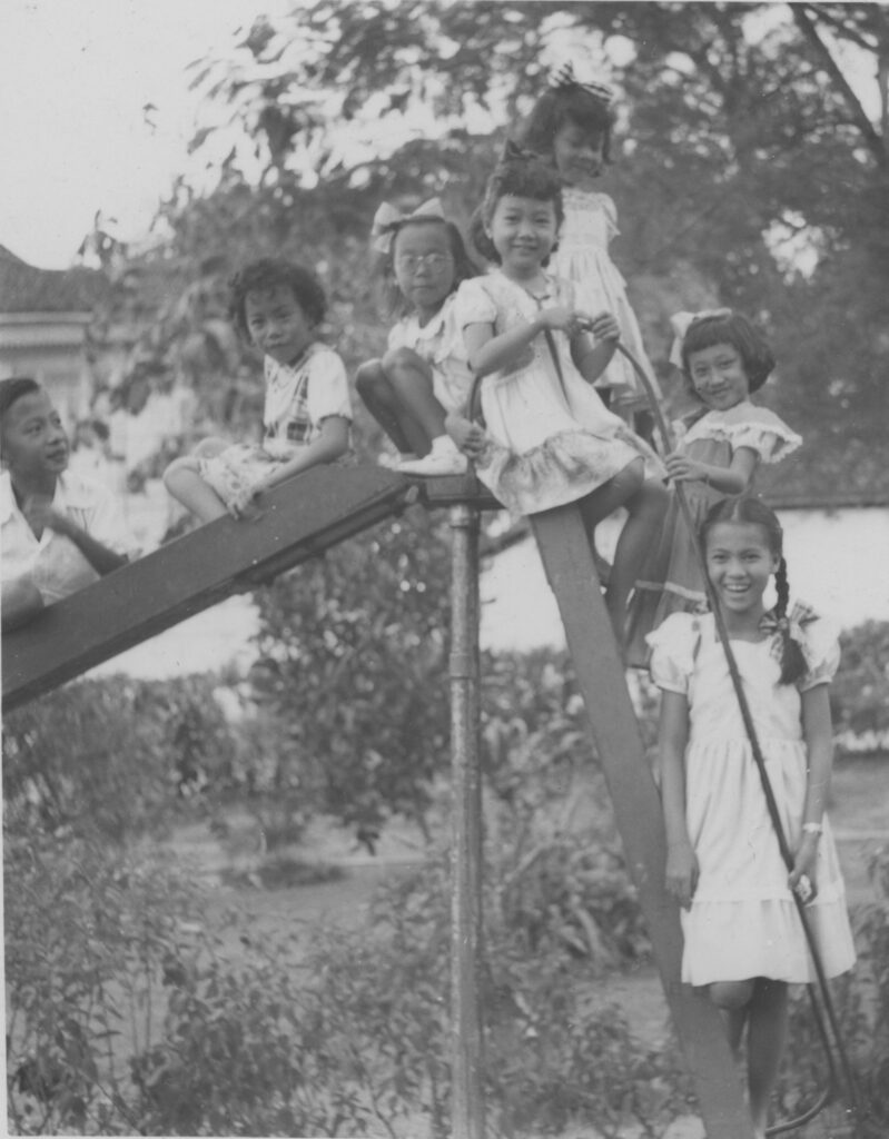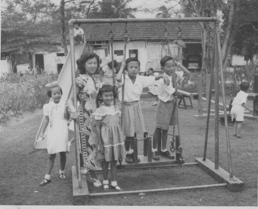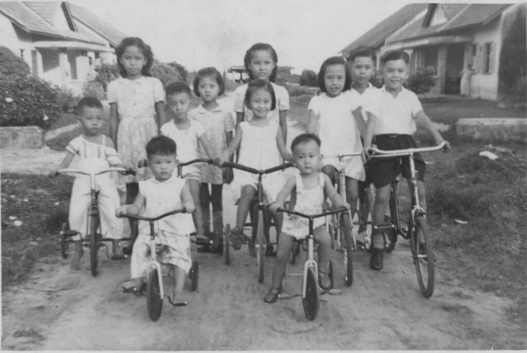 1948: the bicycle brigade at Kuo Chuan Avenue. Maureen is on a tricycle in the middle. The semi-detached houses with modern sanitation were leased from the Lee Kong Chian Estate for $46 a month. There were no fences and the main avenue was then a dirt road that became muddy after the rain.