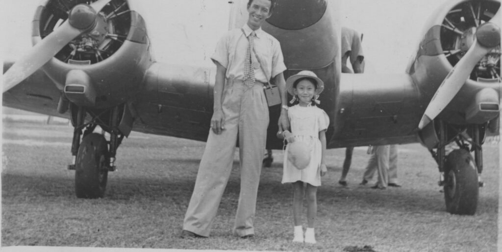 August 1949: Maureen with her father Baba Kong Hai at the air display at Kallang Airport.
