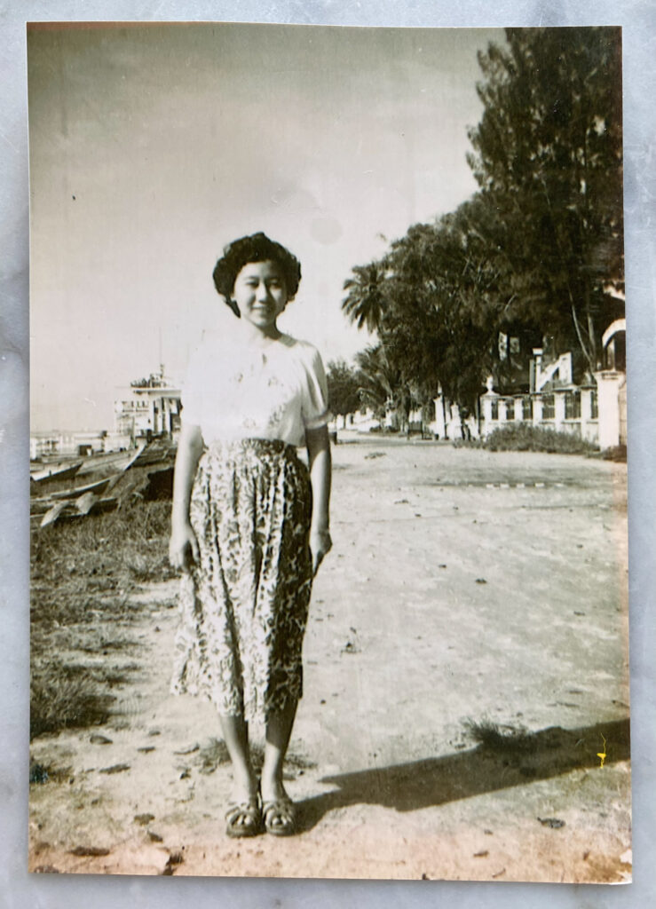 1951: An older Joyce Cheong, 17, at the dirt road outside the Marine Parade home. The building (at top left) was a fisherman’s pier at the beach end of Joo Chiat Road, where sampans were beached. At night when the lights turned on, the pier became one of the earliest open-air hawker centres in Singapore, where Katongites would converge to glut out on fried noodles, chee-ham, rojak, satay chelop. Republic Cinema was later built there on reclaimed land and subsequently demolished to make way for other developments.