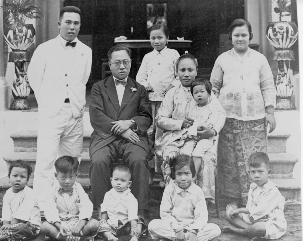 1933: Cheong Koon Seng and his family at their home at 299 River Valley Road. From left: Eldest son Hock Chye (from his first wife), Cheong Koon Seng, Cheong Keong Poh, wife Chia Siew Tin carrying daughter Keong Hee, Ensoh ‘Bulat’, wife of Hock Chye. Younger children seated cross-legged on the floor, from left: Liang Neo, Hock Leng, Thiam Gee, Keong Tuan and Thiam Siew. Hock Chye later founded the valuer and auctioneer company Knight Frank, Cheong Hock Chye & Baillieu. Keong Tuan and Keong Hee were the mothers of siblings Maureen and Alan Koh, and David Ong respectively; the latter three were previous committee members of The Peranakan Association Singapore. Photograph courtesy of Eric Cheong.