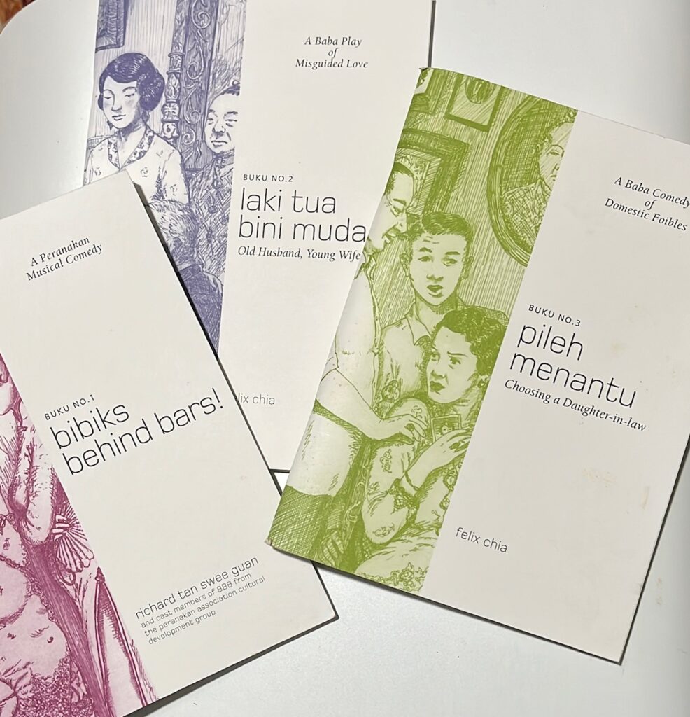 Among the items for the programme that we initiated were the publishing of three Peranakan plays that have since been read out loud by the Chakap Baba-Nyonya play-reading group. The plays are “Pileh Menantu” and “Laki Tua Bini Muda” by Felix Chia, and “Bibiks Behind Bars” by Richard Tan.